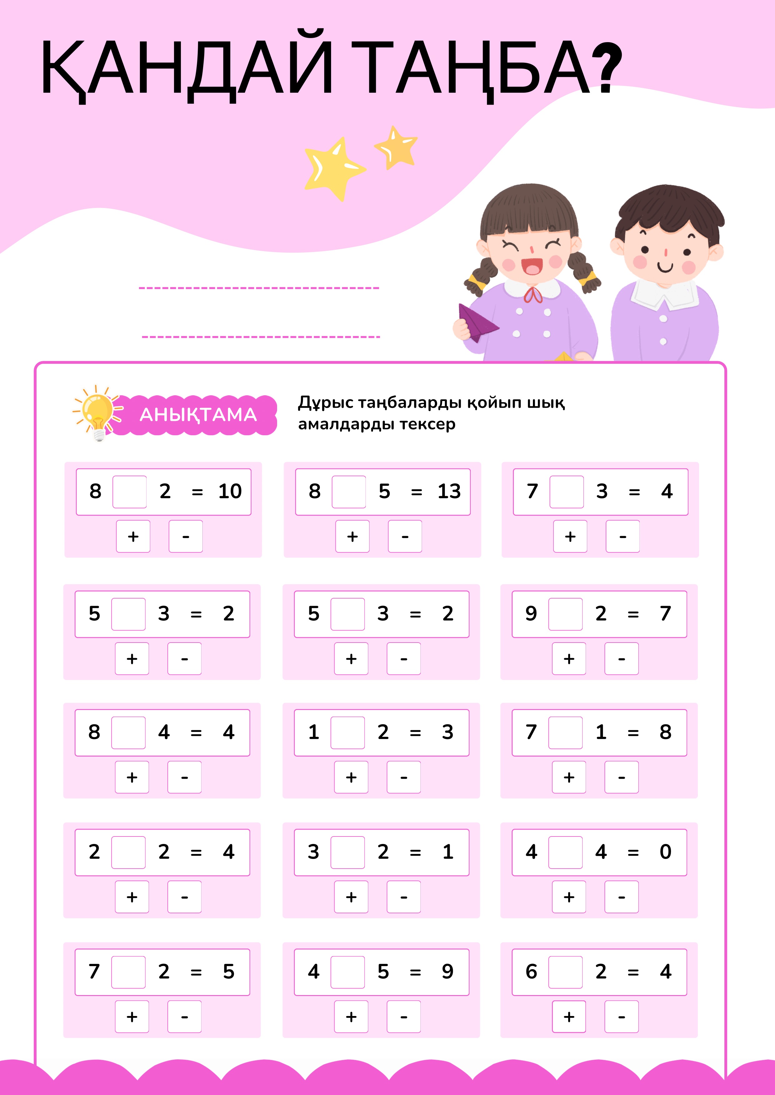 • “Қандай таңба?” бөлімі: оқушылар дұрыс таңбаны (+ немесе –) таңдайды;