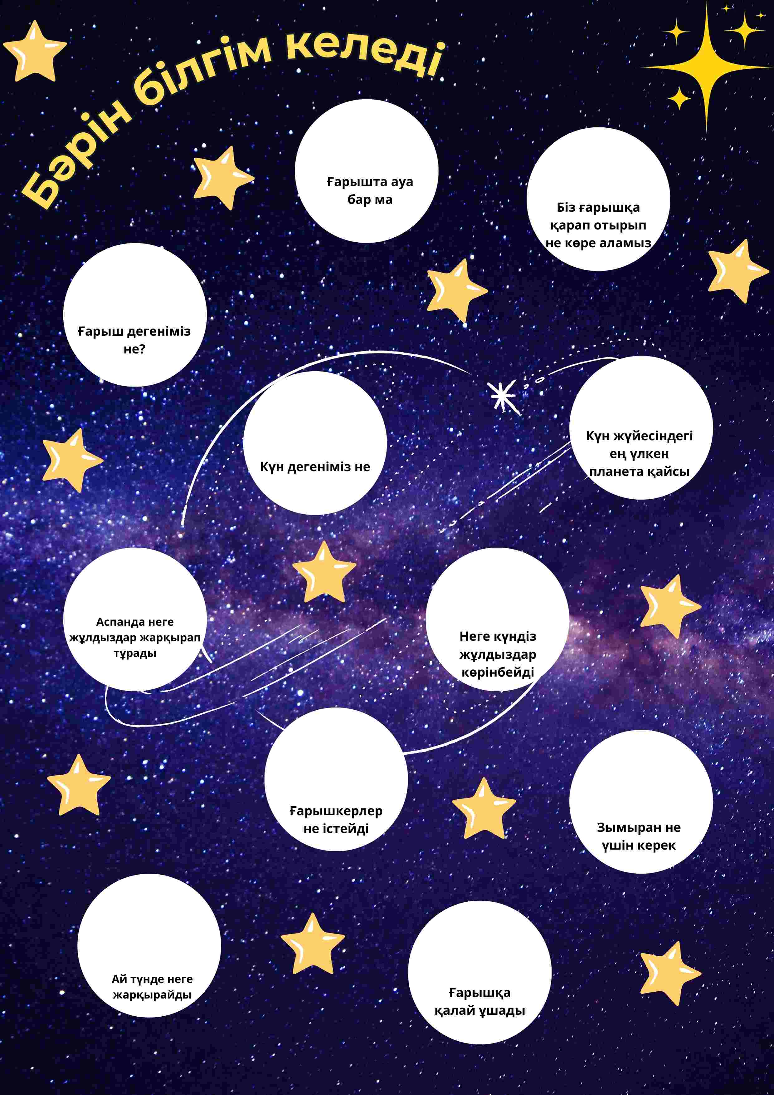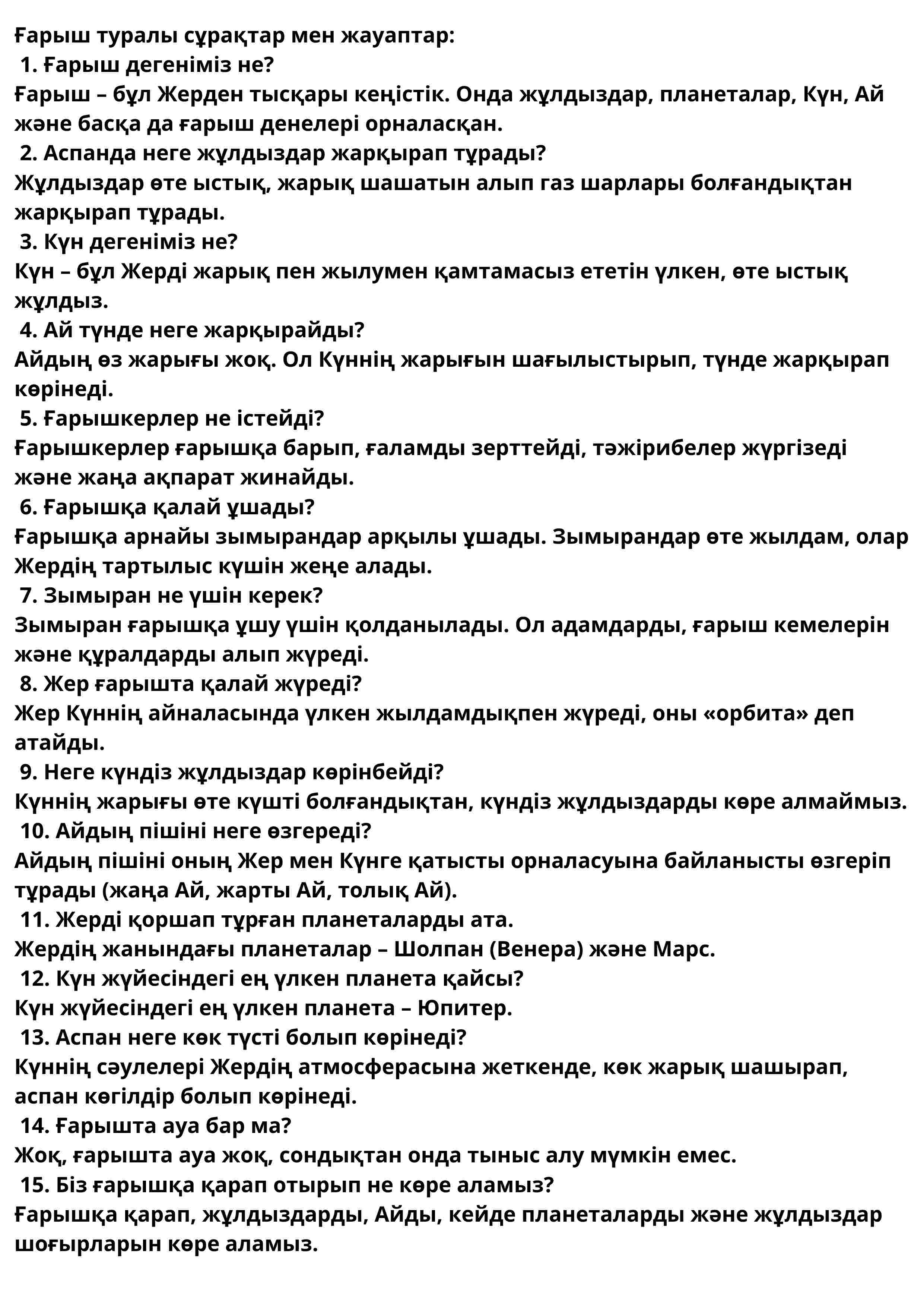 Жинақта ғарыш туралы негізгі сұрақтар қамтылған: ғарыш дегеніміз не, Күн мен Айдың ерекшелігі, жұлдыздардың жарқырауы, ғарышкерлердің жұмысы, зымыранның қызметі және Күн жүйесі туралы мәліметтер.
