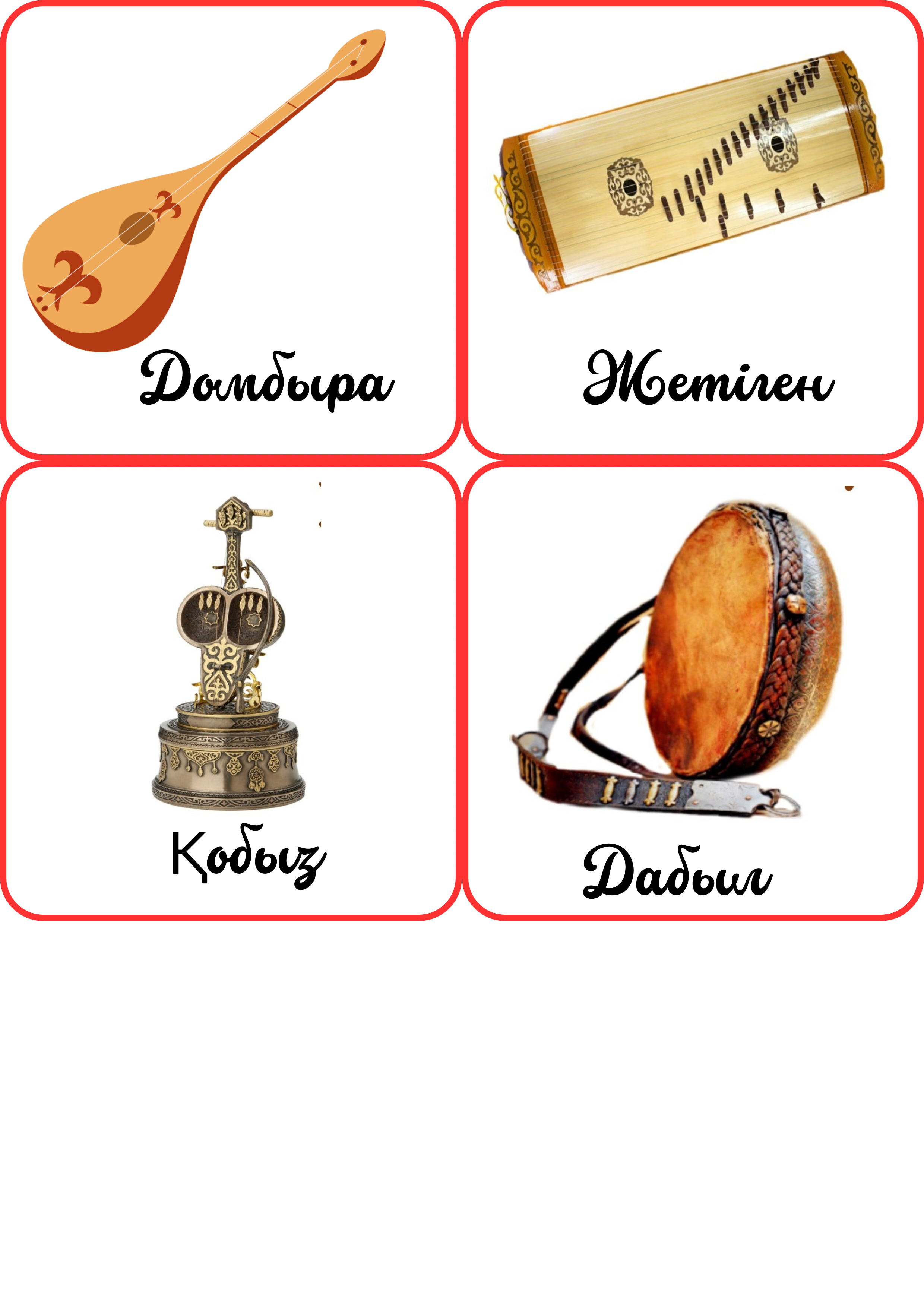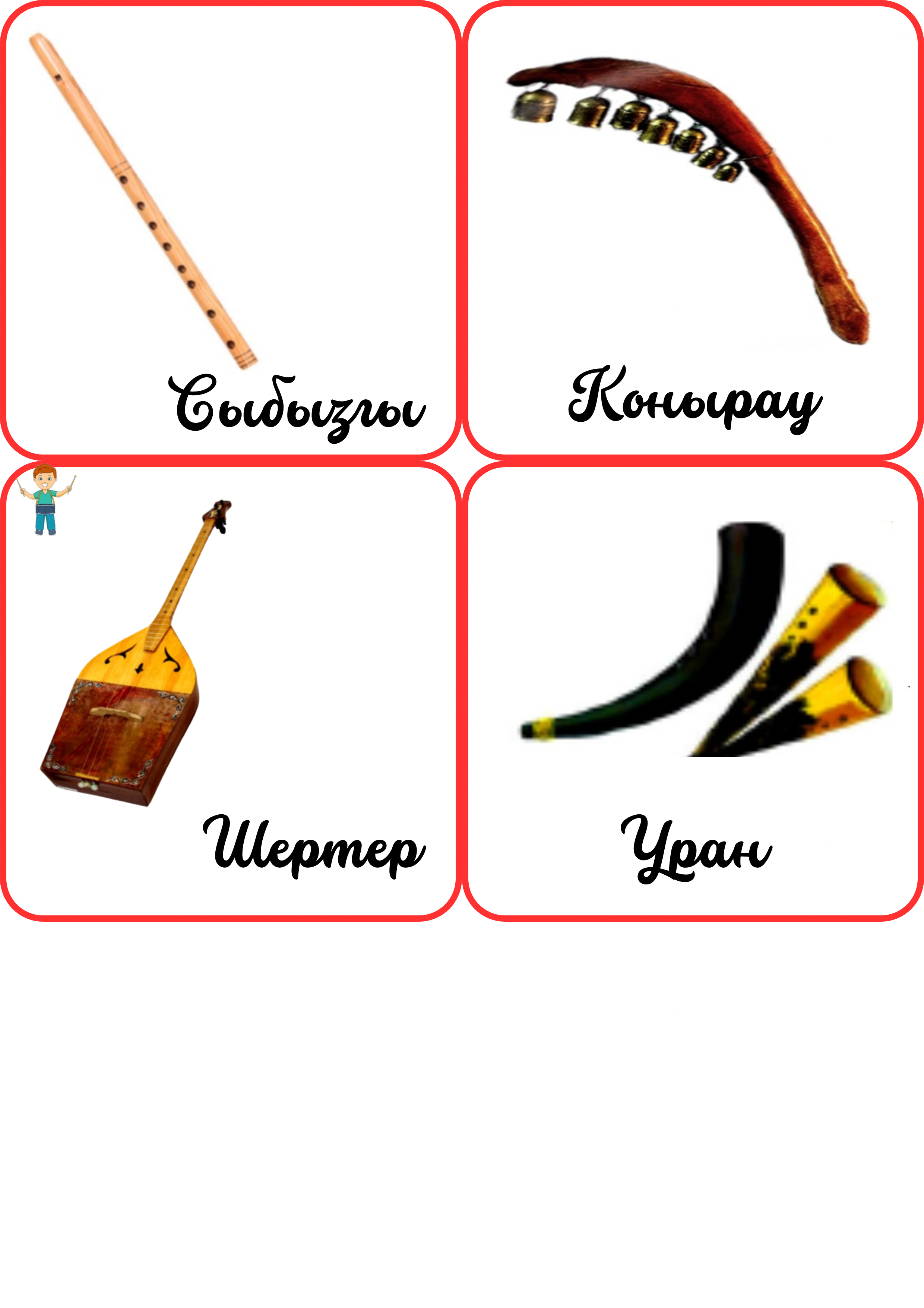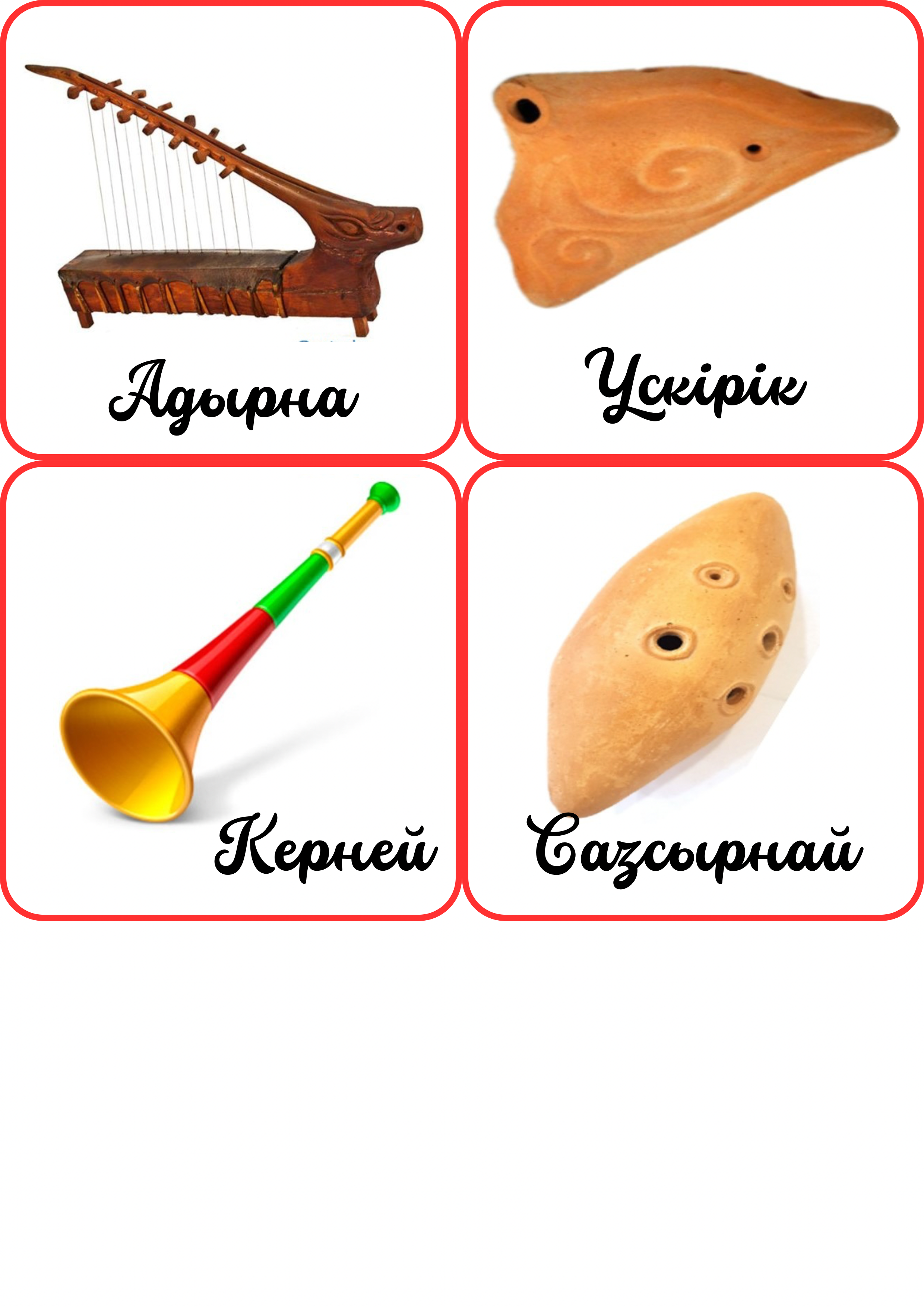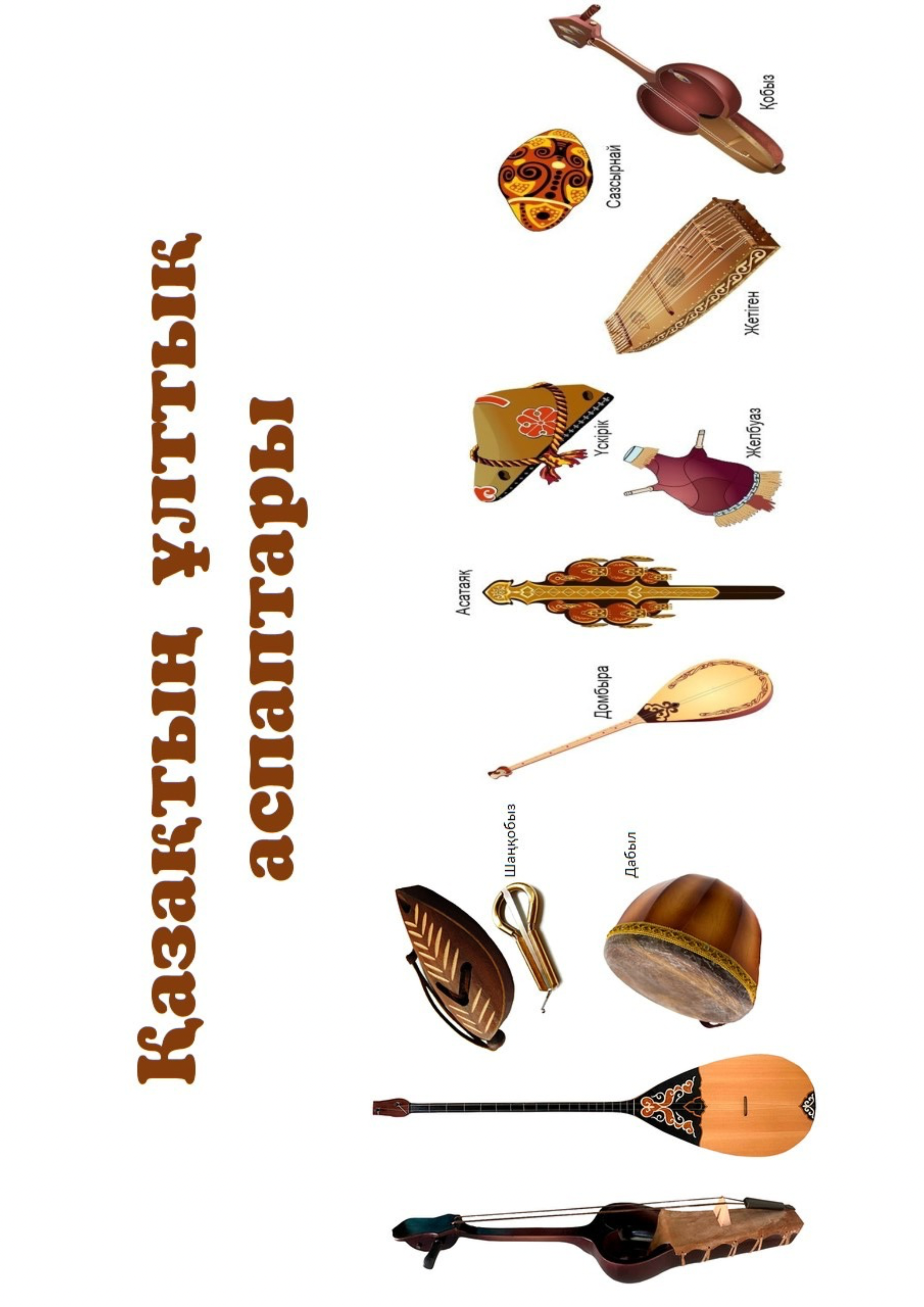Бұл материал — бастауыш және музыка пәні сабақтарында қолдануға арналған «Аспаптар қоржыны» атты көрнекілік. Көрнекілікте қазақтың ұлттық музыкалық аспаптары үш топқа бөлініп көрсетілген: