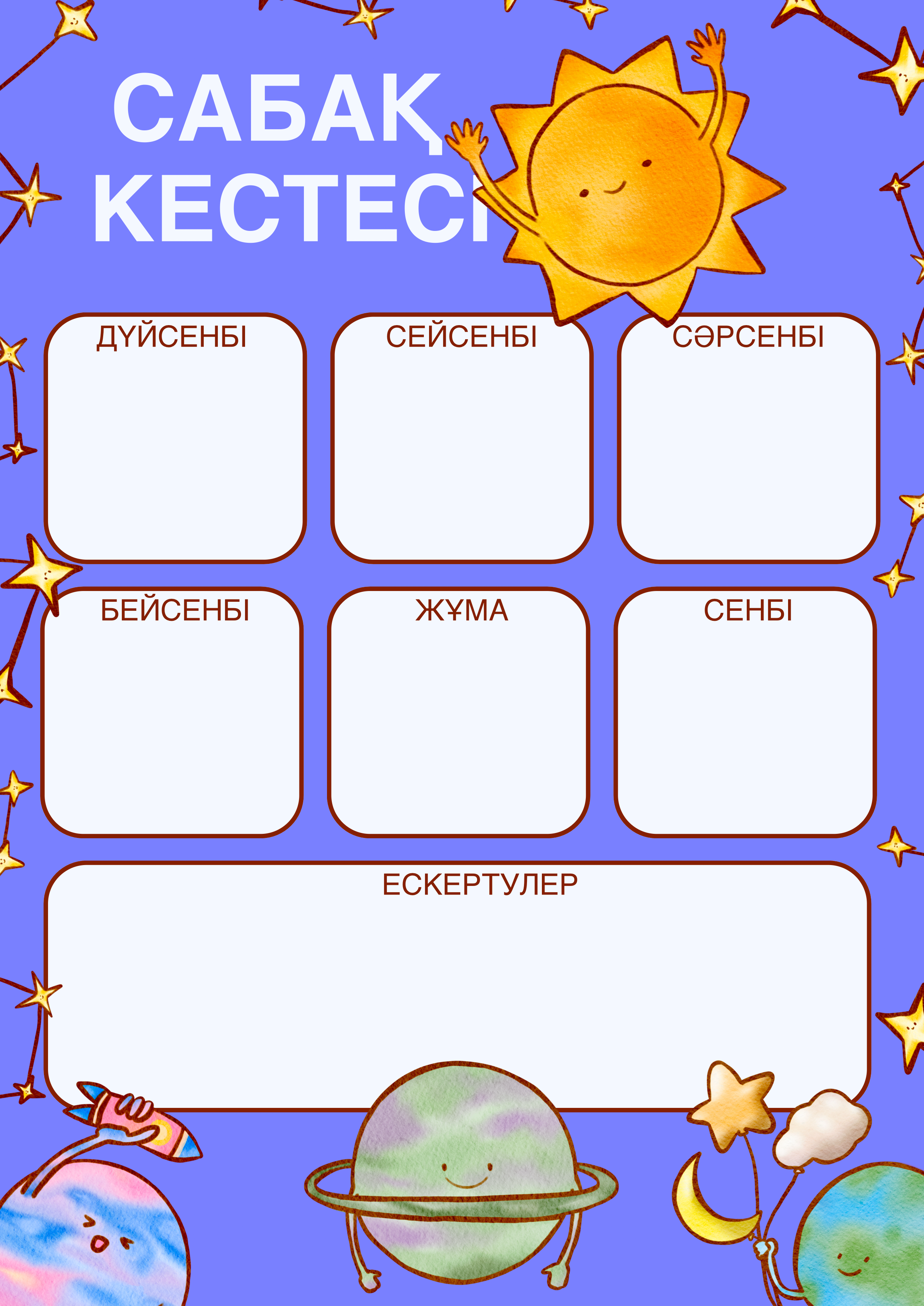 Көрнекіліктер ● Балаларға арналған түрлі түсті “Сабақ кестесі” үлгілері — бастауыш сынып пен балабақшаға арналған басып шығаруға дайын шаблондар
