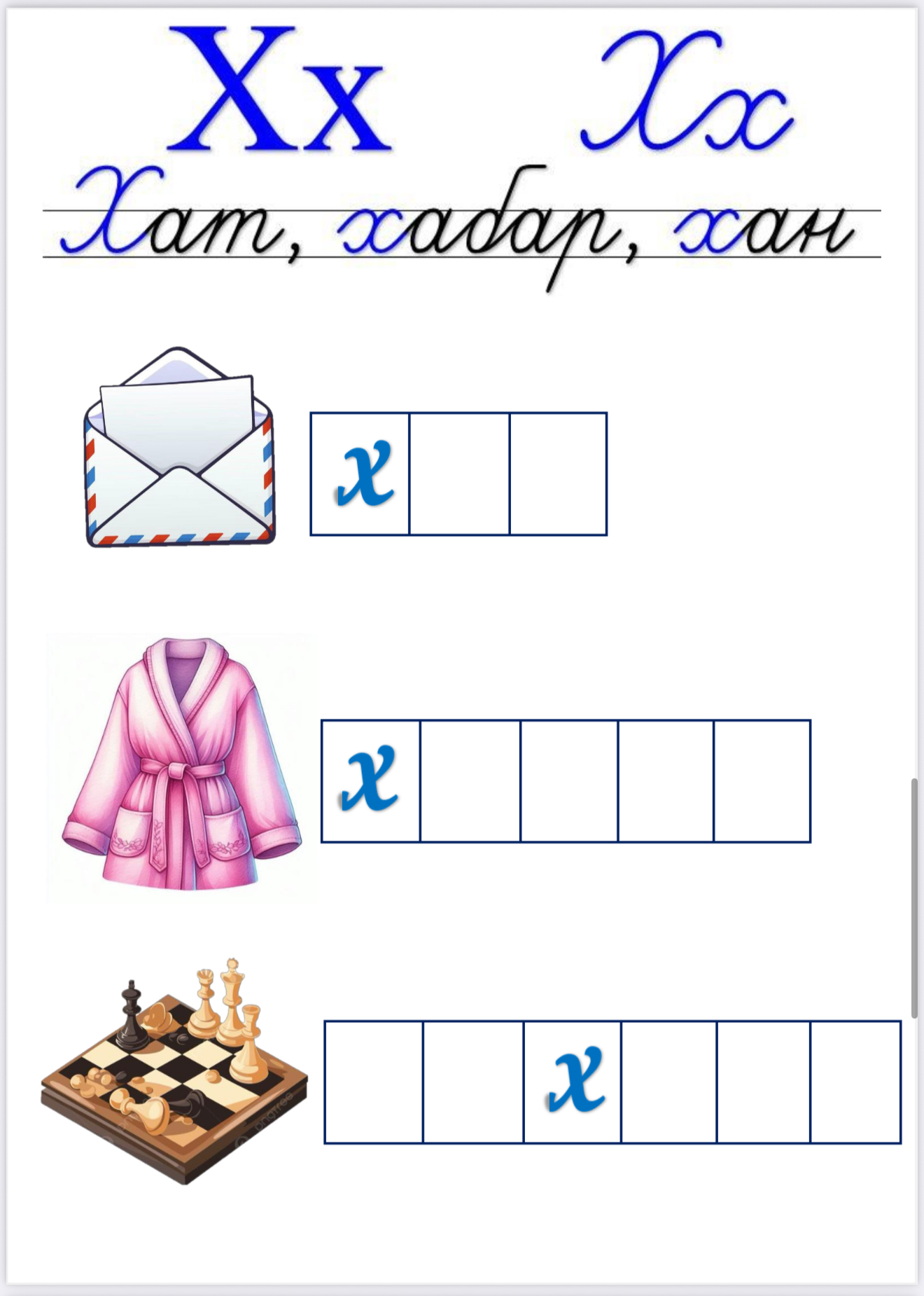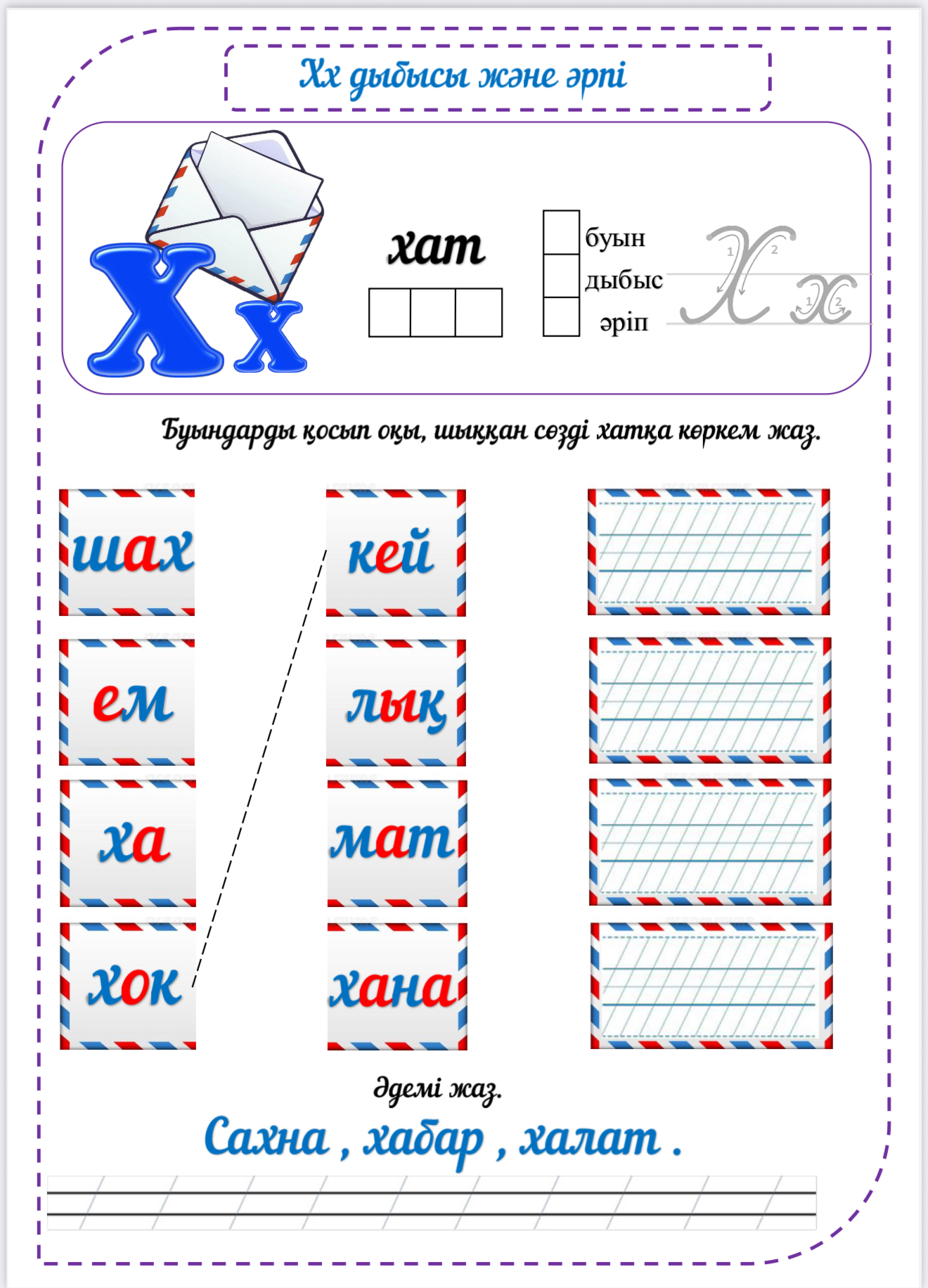 Х дыбысы мен әрпін үйретуге арналған жұмыс парақтары – буындап оқу, жазу және логикалық тапсырмалар