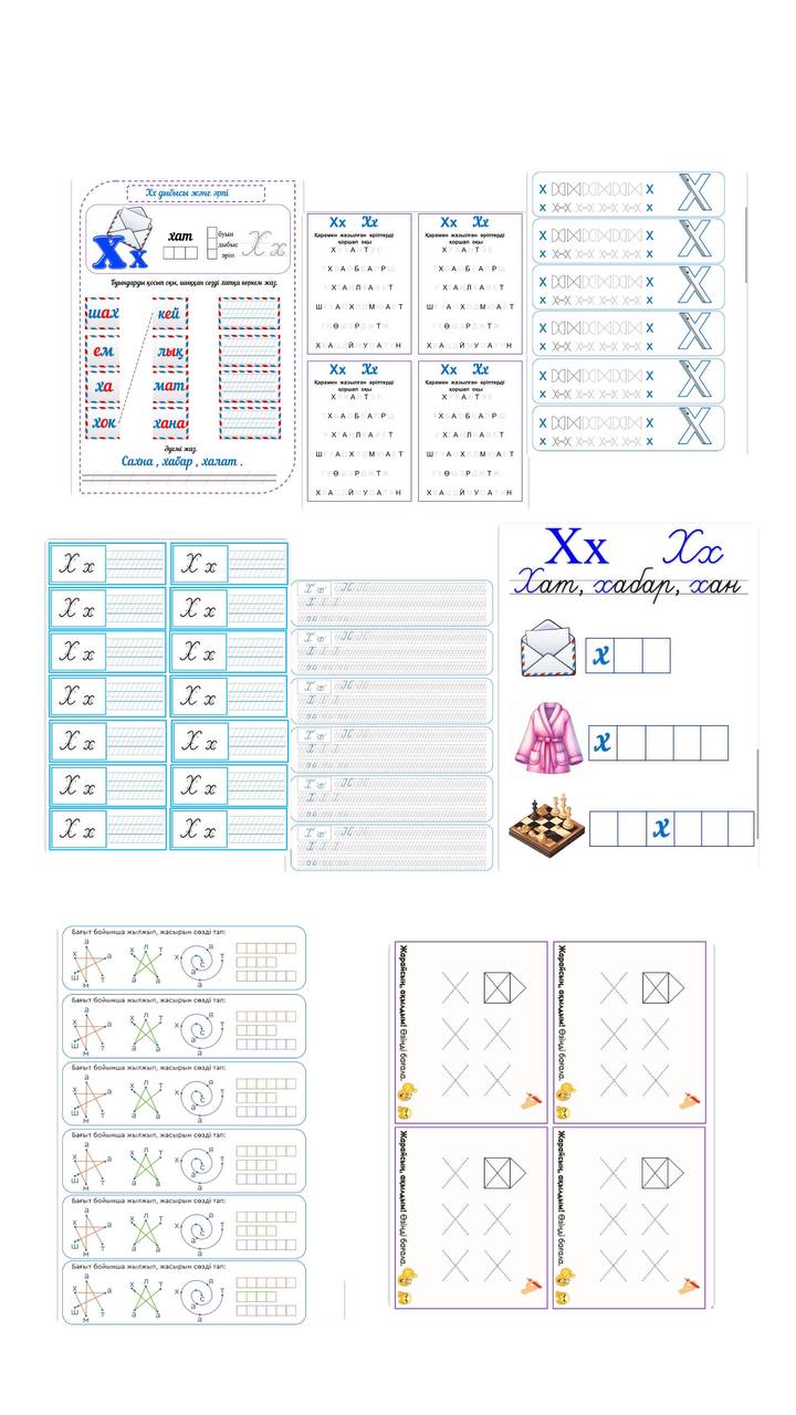 Көрнекіліктер ● Х дыбысы мен әрпін үйретуге арналған жұмыс парақтары – буындап оқу, жазу және логикалық тапсырмалар