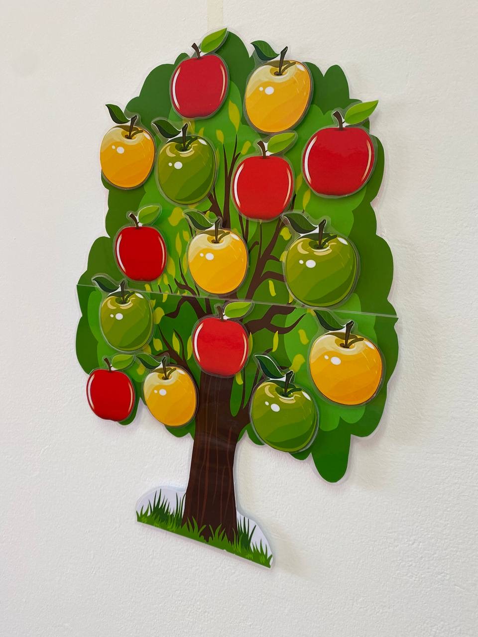 3️⃣ Балалар алмаларын ағашқа жапсырады