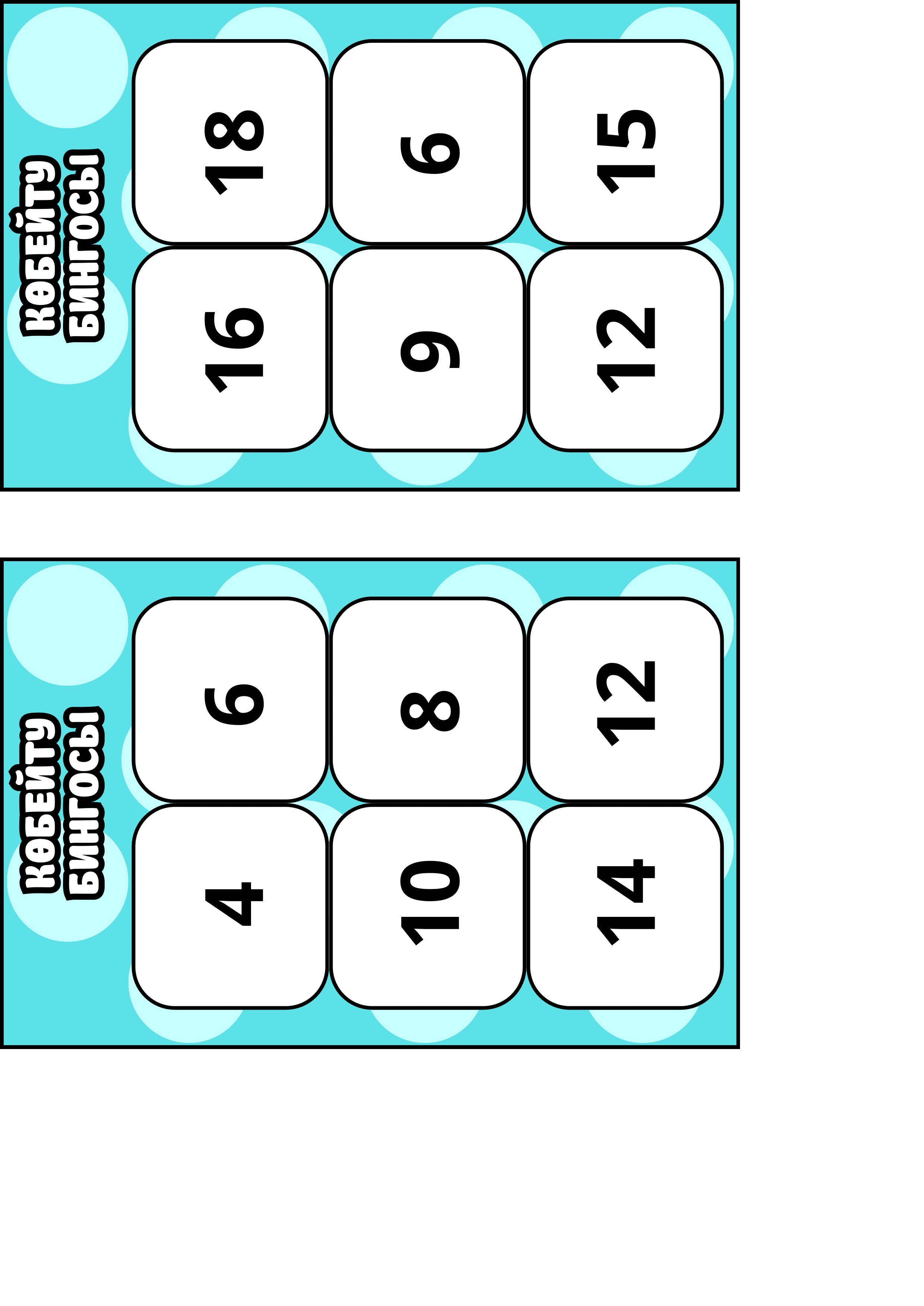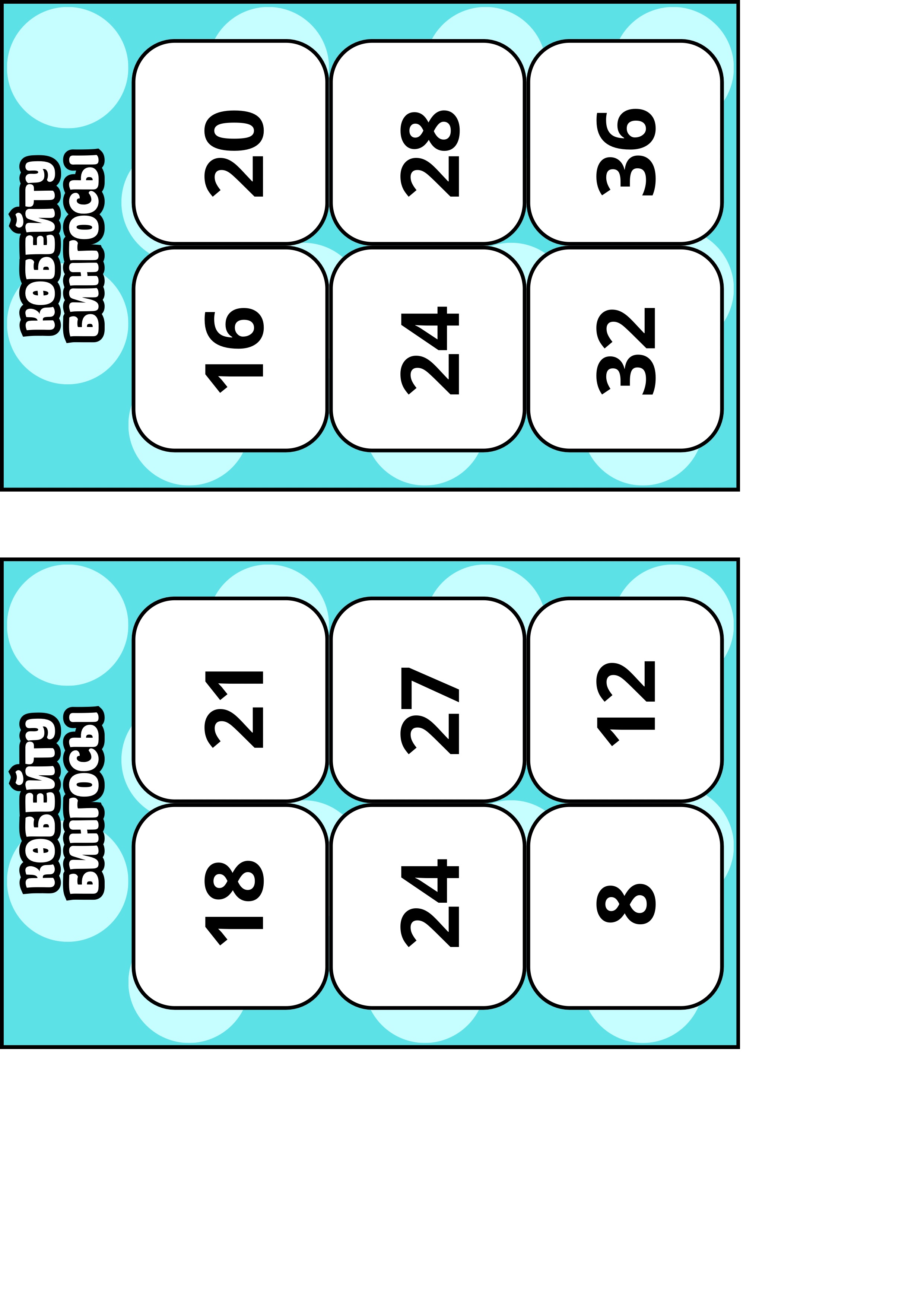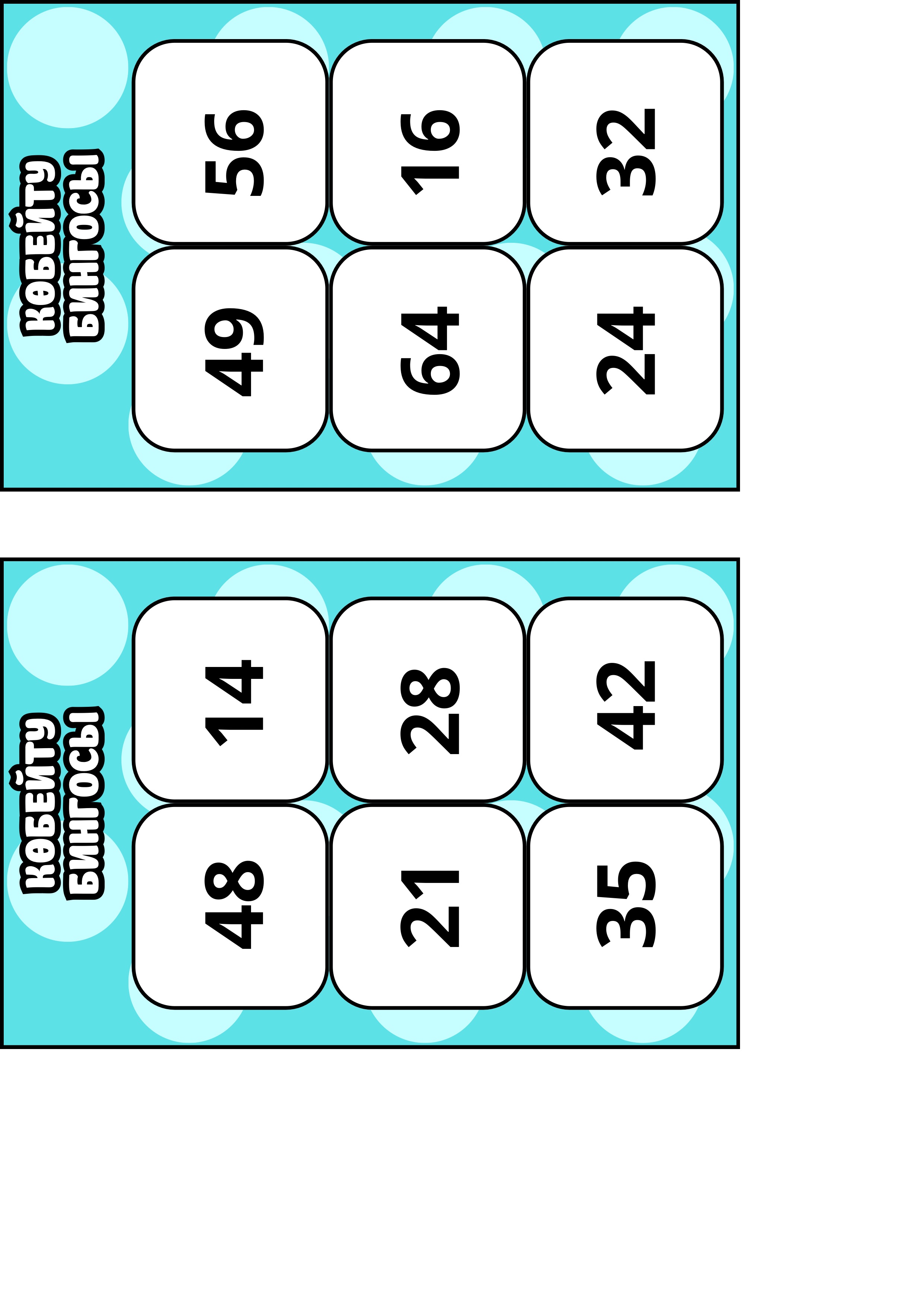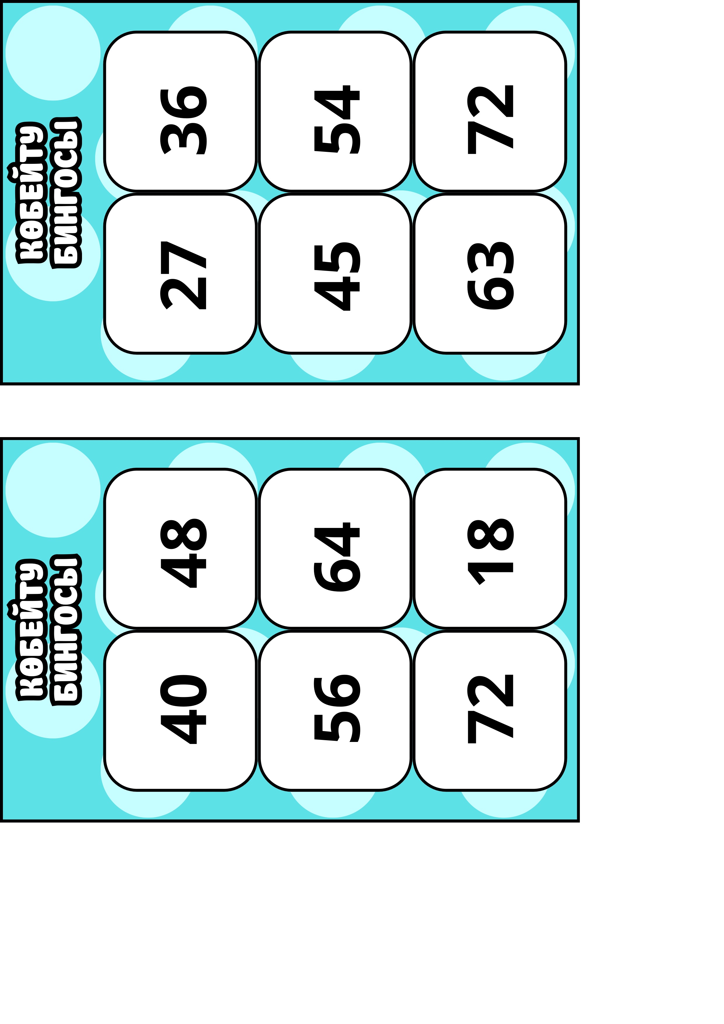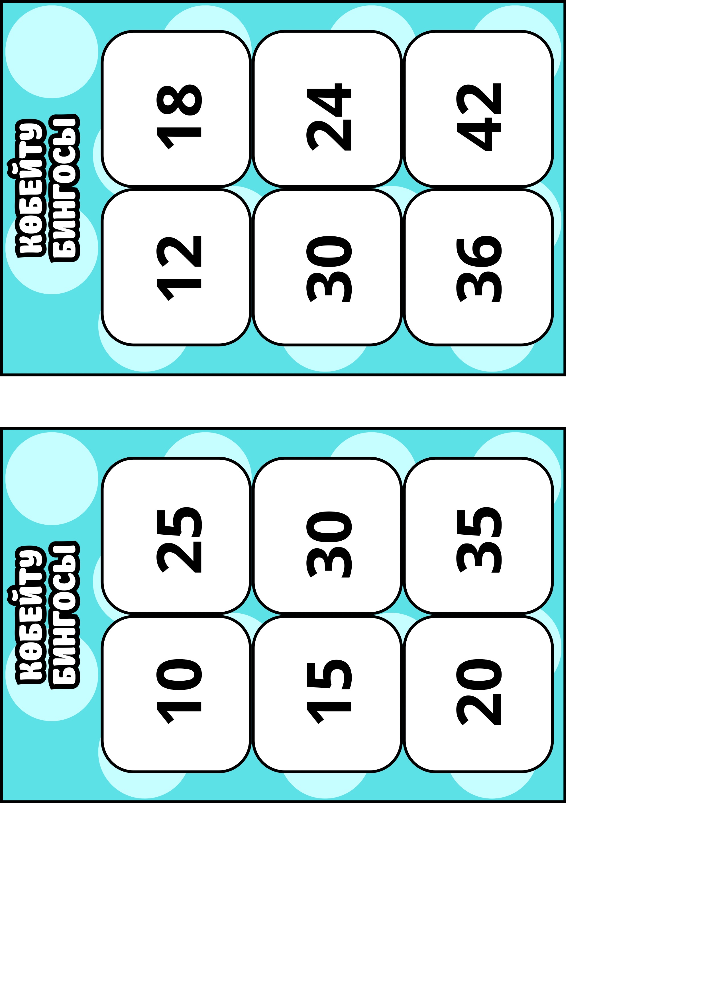 • 5 түрлі “БИНГО” парағы – әр парақта 1–9 сандары бойынша көбейту нәтижелері орналасқан;