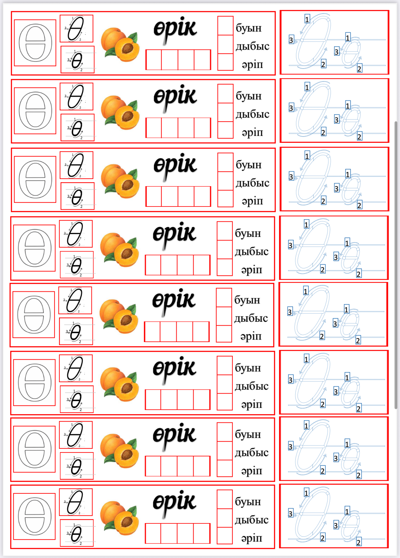 Бұл оқу құралы 1 сынып оқушыларына «Ө дыбысы мен әрпін» оңай әрі қызықты меңгертуге арналған. Материалдарда әріпті дұрыс жазуға арналған бастырып жазу үлгілері, буындап оқу тапсырмалары, суретпен жұмыс, сөздерді сәйкестендіру, дыбыс пен әріпті ажырату, буын–дыбыс–әріп санын анықтау жаттығулары қамтылған.