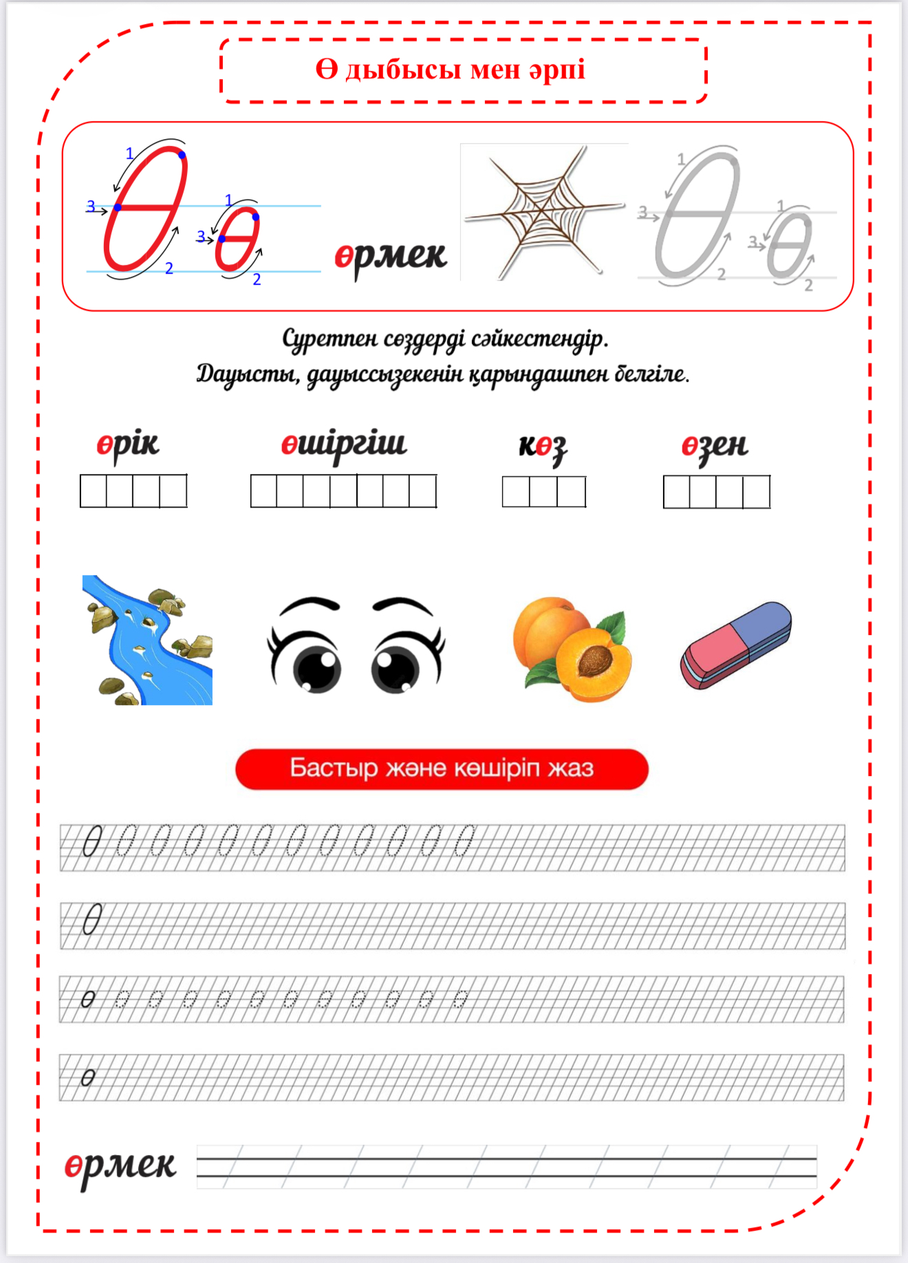 Ө дыбысы мен әрпі – 1 сыныпқа арналған көрнекі тапсырмалар мен жазу жаттығулары