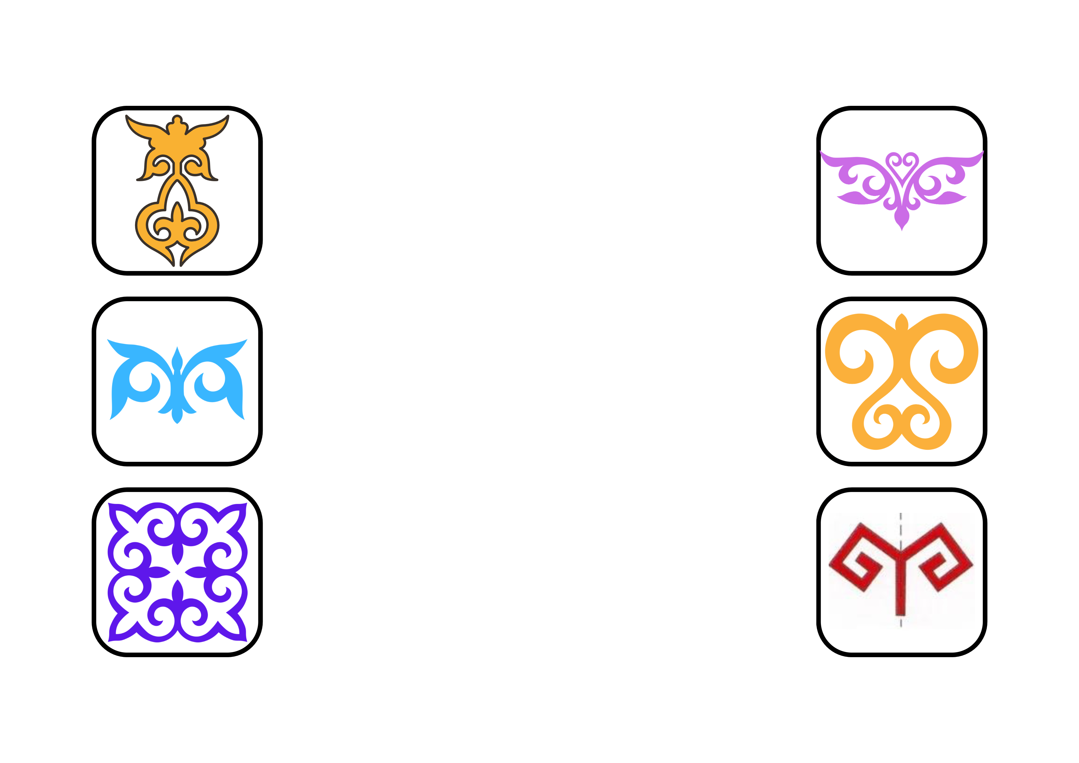 Көрнекіліктер ● «Қазақ оюлары: Қошқар мүйіз, Құс қанат, Көбелек — ою түрлерін атауларымен сәйкестендір»