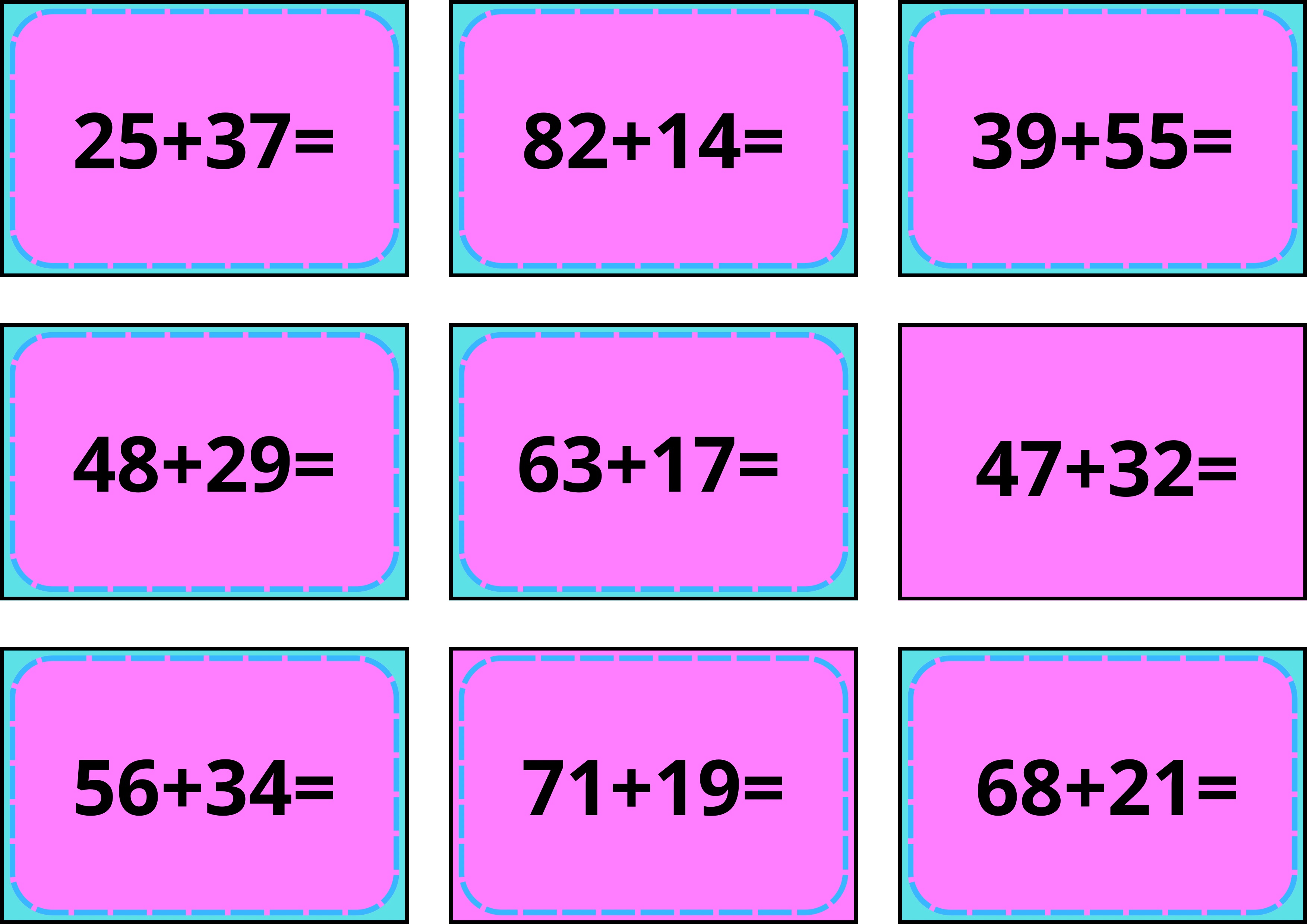 ➕ 25 + 37 =, 48 + 29 =, 56 + 34 =, 71 + 19 =