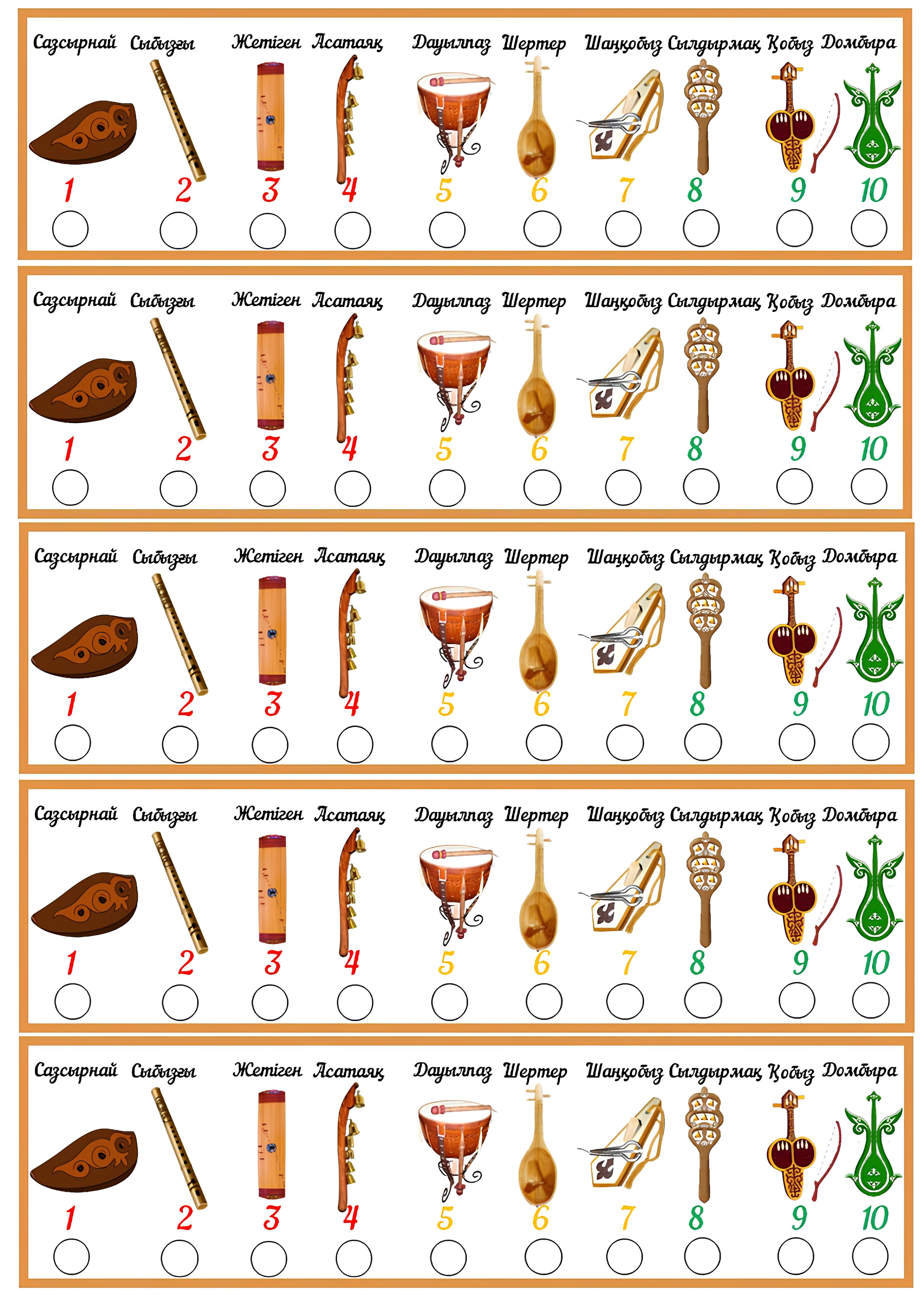 Бұл “Ұлттық аспаптар бағалау” материалы — музыка сабақтарын қызықты әрі жүйелі ұйымдастыруға арналған тамаша құрал. Әр жолда қазақтың дәстүрлі музыкалық аспаптары бейнеленген: сазсырнай, сызғышы, жетіген, асатаяқ, дабылпаз, шертер, шаңқобыз, сылдырмақ, қобыз, домбыра. Оқушыға әр аспапты тану, ажырату және бағалау мүмкіндігі беріледі.